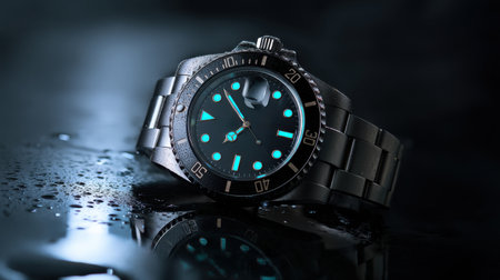 A sleek diver watch with a black face and luminous markers rests on a reflective wet surface. Water droplets shimmer around it while soft light highlights its stylish design