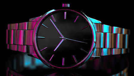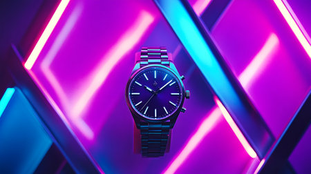 Wristwatch on a purple background. 3D rendering. Neon lights.