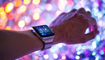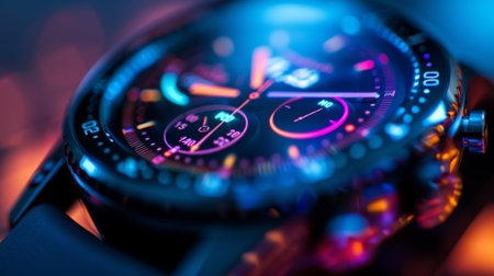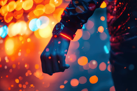 Close-up of a modern smartwatch against vibrant bokeh lights