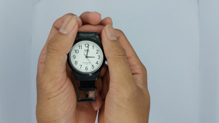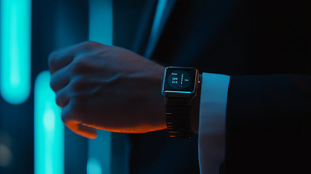 Modern men watching time on futuristic digital wristwatch in studio generated by artificial intelligence