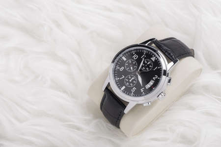 Men accessories on white background. Closeup at luxury men watch with black dial and leather strap.