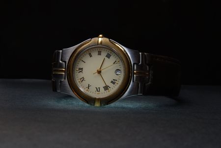 Modern metal wristwatch, it's exactly 6 o'clock, close-up view.