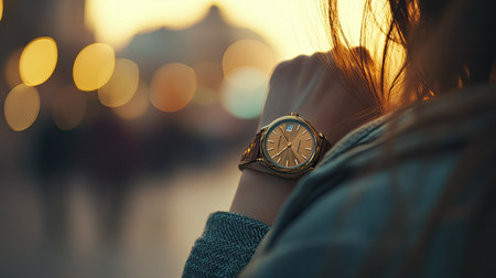 A close-up captures a golden wristwatch on a person's wrist, the focus sharp on the watch face. The scene uses warm lighting, possibly sunlight, with a soft-focus backdrop. This image could be suitable for promotional materials, articles related to fashion, or themes of time and luxury.