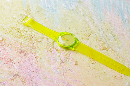 Stylish women's watch hangs in the air on a yellow background. Women's accessories.