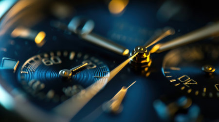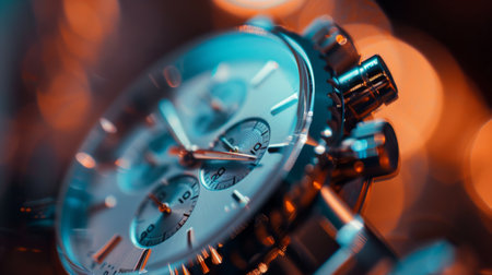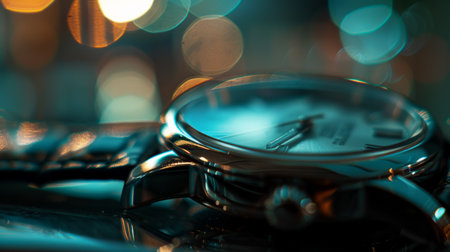 A mesmerizing closeup image of a luxury watch revealing its sleek design and intricate dials The reflective surfaces and fine craftsmanship are enhanced by soft focused lighting showcasing the shimmer and detail of the watch face and strap