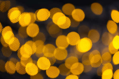 Bokeh on Christmas night. Beautiful round bokeh highlights. Golden and yellow color flashes in the dark. Festive background for New Year Merry Christmas. Blurred defocus. Decoration of city streets