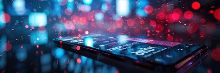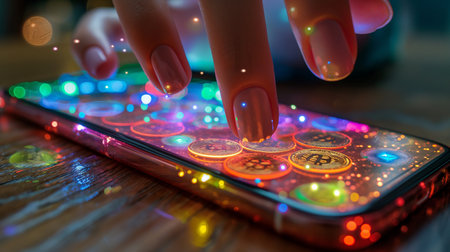 Smartphone screen displays a digital wallet interface featuring transaction details and glowing icons in a softly lit environment with blue and purple tones.