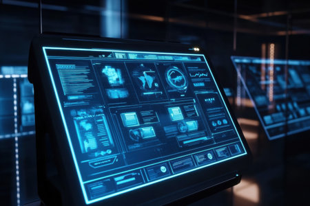 A sleek and modern voting system utilizes holographic touch screens and transparent UI elements, offering an innovative experience for users.