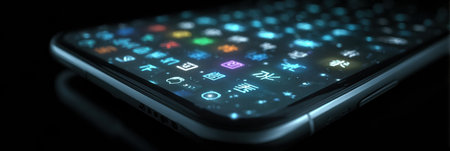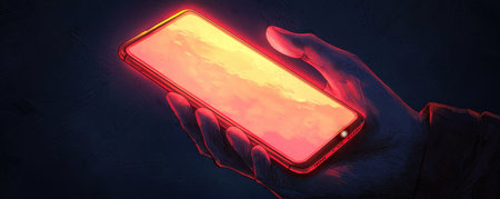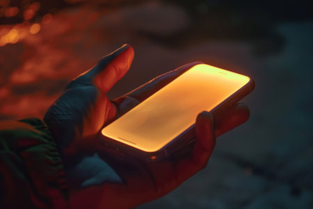 Hand holding illuminated smart phone, close up of touch screen technology generated by artificial intelligence