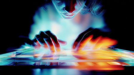 Fingers glide swiftly over a colorful keyboard, illuminating the dark with radiant patterns of light and energy.