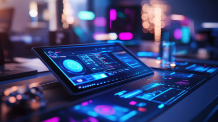 Closeup of a touchscreen control panel on a desk surrounded by a minimalist design aestheti