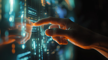 A person interacts with a glowing digital interface, the red tones casting a warm hue over the scene of modern technology.