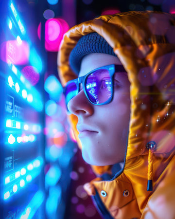 This image showcases a high-tech digital interface featuring vibrant neon visuals and intricate data representations, ideal for technology and innovation themes.
