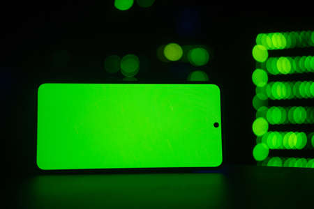 Empty blank with a green background on the phone screen, copy space. Smartphone on the background of a dark server room, mockup