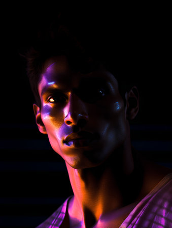 Fashion portrait of a young man with neon light on his face