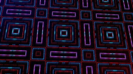 Pulsating neon light overlays create dynamic patterns against a dark background