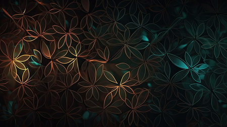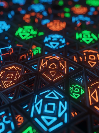 Green showing intricate geometric shapes with glowing neon outlines in vibrant blue orange and green form a complex tessellated pattern against a dark background...