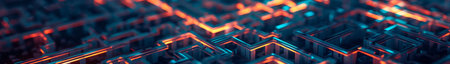 A visually striking abstract pattern featuring a 3D maze-like design with vibrant red and blue glowing elements. The geometric shapes create a sense of depth and movement, reminiscent of futuristic architecture or digital art.