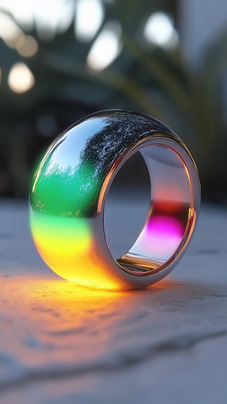 A stunning glass ring featuring a spectrum of colors, brilliantly reflecting light against a dark surface. Ideal for showcasing creativity and elegance.