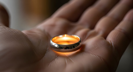 A single, simple ring rests in the palm of a person's hand, glowing with a warm, magical light from within. The soft focus and intimate framing create a sense of mystery, importance, and fantasy. This image is perfect for concepts related to magic, love, promises, or a powerful artifact.