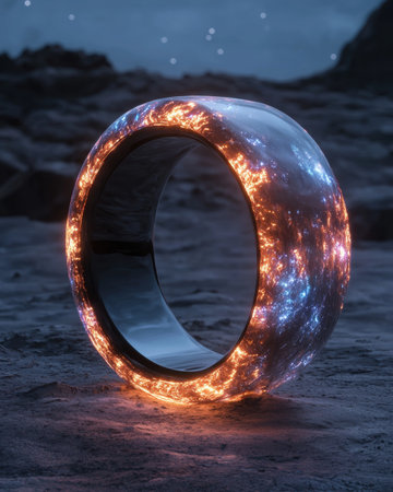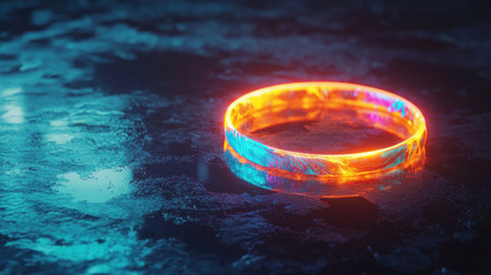 Futuristic Glowing Ring Rests on a Dark Surface With Vibrant Light Reflections and Intricate Designs Visible in the Material at Night. Generative AI