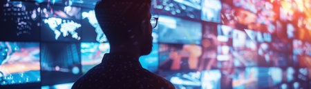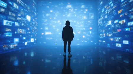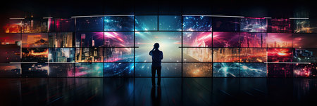 A person stands alone in front of a mesmerizing digital display wall, showcasing a variety of media content, creating a futuristic atmosphere.