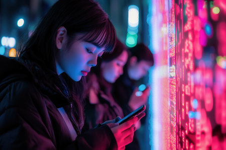 Individuals focus on their smartphones, absorbed in the virtual world, surrounded by bright digital codes during a nighttime urban setting.