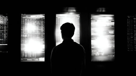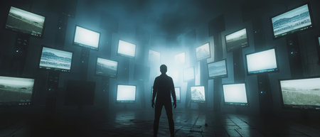 , faceless figure, constantly monitored, navigating a maze of screens, misty weather, photography, moody silhouette lighting, HDR effect , Tilted angle vie