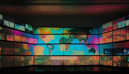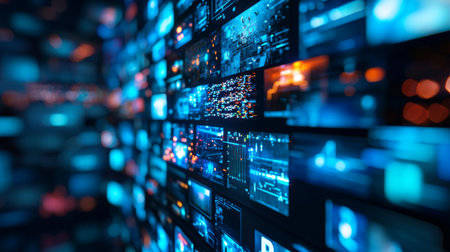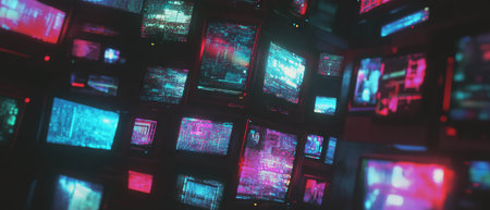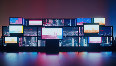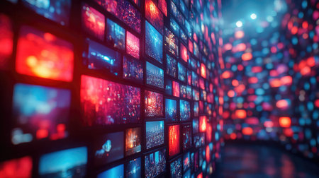 Vibrant digital display with multiple screens showcasing modern media and high tech lighting effects