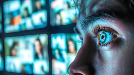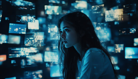 Woman immersed in a sea of big data from streaming services and social media platforms