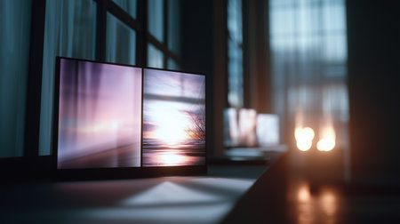 Artwork displayed in a dimly lit room with soft natural light highlighting sunset visuals on digital screens