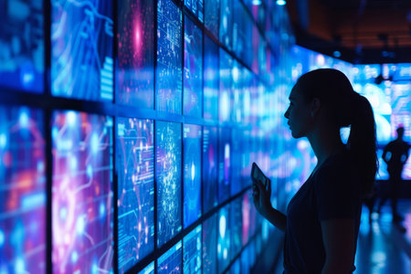 A woman stands in front of a large screen, interacting with the content displayed, Digital screens displaying interactive content