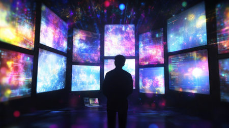 Silhouette of a person standing in front of a wall of screens displaying colorful images.