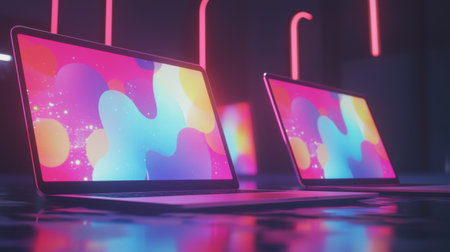 Three sleek laptops with vibrant screens display digital art, casting a neon glow in a dark room.