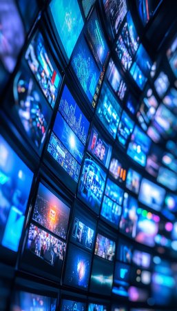 Dynamic wall of digital screens showcasing video content with blurred dark blue background