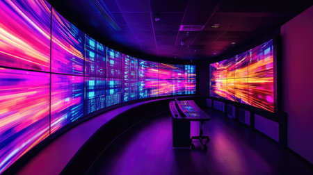 A visually striking control room featuring an array of colorful digital displays and dynamic neon lighting, creating a vibrant and immersive high-tech atmosphere.