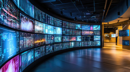 Room with curved wall of digital screens displaying various images, futuristic and immersive