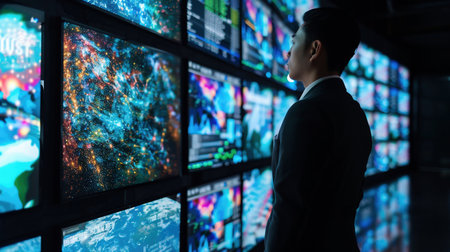 Programmer analyzing data on multiple screens in futuristic control room