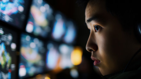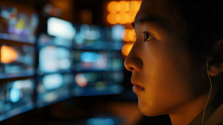 Close-up of a person's face illuminated by the soft glow of multiple computer screens in a dark, high-tech environment
