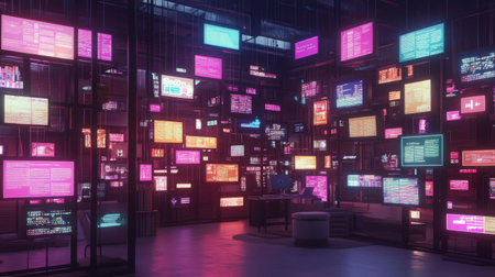 Explore a vibrant tech interface filled with colorful screens showcasing various data and information, creating a modern and immersive workspace atmosphere.