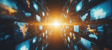 Colorful digital maps illuminate a corridor, showing real-time global data trends in a tech hub.