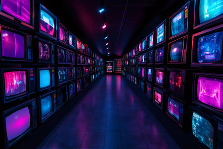 Many retro television sets displaying colorful static noise create a vibrant and nostalgic atmosphere in a dark hallway illuminated with pink and blue lights