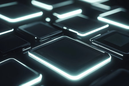 An overhead perspective reveals a geometric design featuring a grid of blue squares accented by yellow illuminated elements. The visual characteristics incorporate a pattern with depth of field and soft lighting. This composition could be suitable for various commercial uses, including website backgrounds or graphic design applications.