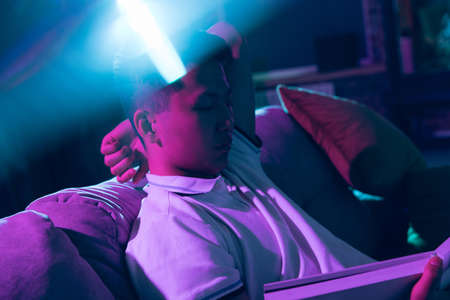 Evening mood. Cinematic portrait of stylish young man in neon lighted room. Bright neoned colors. African-american model, musician indoors. Youth culture in party, festival style and music concept.