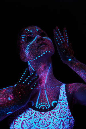 Model in image of Native american with neon makeup, which made of fluorescent paint in ultraviolet light.