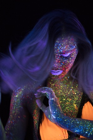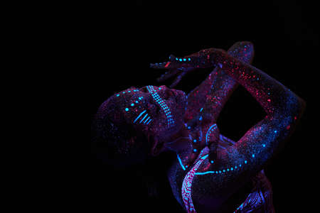 Art woman cosmos in ultraviolet light. Entire body is covered with colored droplets. Girl posing in the dark. Noise, out of focus