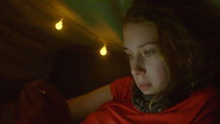 The girl is holding a Christmas garland in her hands. Preparing for Christmas. A smiling woman looks at a lit garland. Festive Illumination.