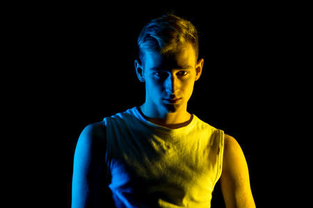 Portrait of a young man. Portrait of a handsome man, looking in the camera. Closeup face of a caucasian teenage boy. Confident and serious look of a teenager, posing at studio. Art style. Low key.