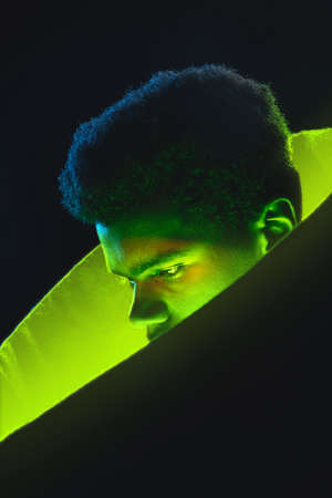 Closeup portrait of a charming handsome black man looking at the camera in neon light in the shade.