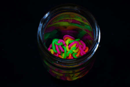 Plastic chain joints, colorful children's toys in glass bottles. On a black background.,Colorful children's toy plastic chain